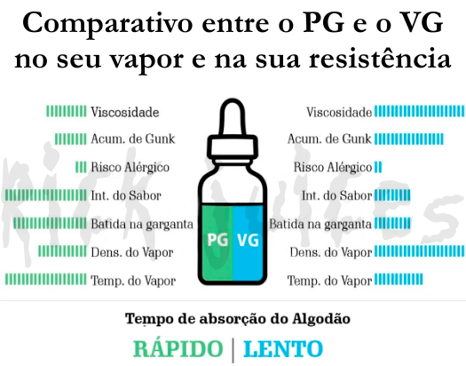 Os dois fluidos têm consistências diferentes e um sabor ligeiramente diferente. Eles têm sensações distintas na boca e na garganta quando vaporizados. A maioria dos elíquidos modernos usa uma combinação dos dois fluidos, embora a proporção possa variar dramaticamente. Algumas configurações do kit inicial de vaporização só podem funcionar com um certo nível de PG e VG. Escolher a relação PG/VG errada pode desanimar os novatos, então tome cuidado ao escolher o nível certo para o seu equipamento.